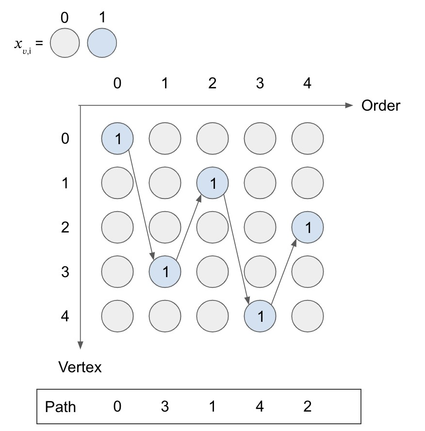 Without loss of generality, we label the vertices by \(1, \cdots, V\) and assume the edges are directed; i.e. \((uv)\) and \((vu)\) denote different edges from each other. For the given graph \(G = (V, E)\), we consider that a vertex \(v\) is visited in the \(i\)-th step if a binary variable \(x_{v,i}\) is \(1\), and vice versa.