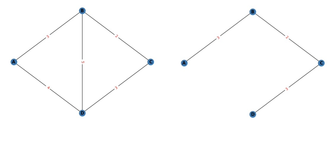 Let us consider a simple graph shown below. Suppose we want to find the minimum spanning tree of the left graph subject to a maximum degree constraint of 3. The solution to this problem is given on the right; the edges in this tree have a total weight of 8, which is the minimum possible, and the maximum degree constraint is satisfied.