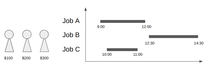 Suppose that we want to allocate multiple jobs to multiple workers. You have to pay a cost per worker. Given the start time and end time of each job and the costs of each worker, minimize the workers’ cost under the constraints;