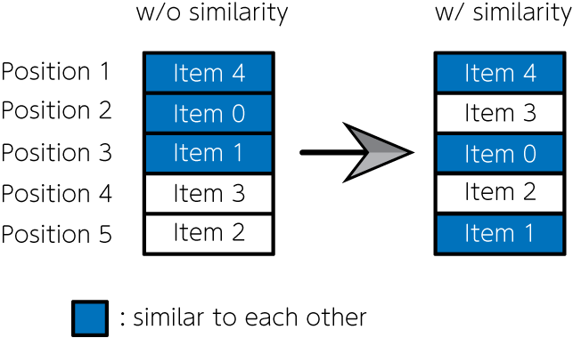 where \(f_{ii'}\) is the items’ similarity degree between item \(i\) and \(i'\), and \(d_{jj'}\) is the adjacent flag of the position \(j\) and \(j'\); \(d_{jj'} = 1\) is for the adjacent positions, otherwise \(d_{jj'} =0\). By introducing this term into the above objective function, we can get results in which items with small similarity are lined up in adjacent positions. From the above discussion, the function we have to maximize in this optimization problem is expressed as follows: